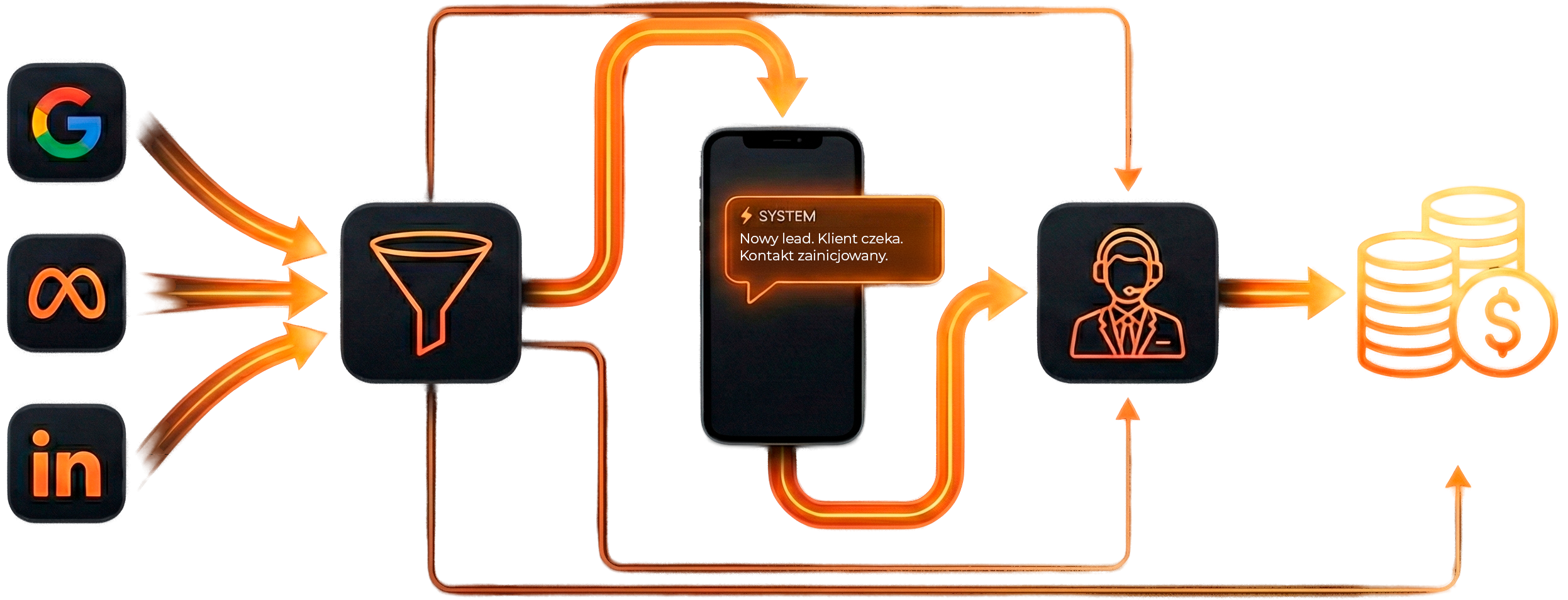 To nie jest kolejna kampania reklamowa. To silnik, który łączy kropki między Facebookiem, Google a Twoim telefonem. Zarządzamy całym przepływem danych, byś Ty mógł zarządzać sprzedażą.